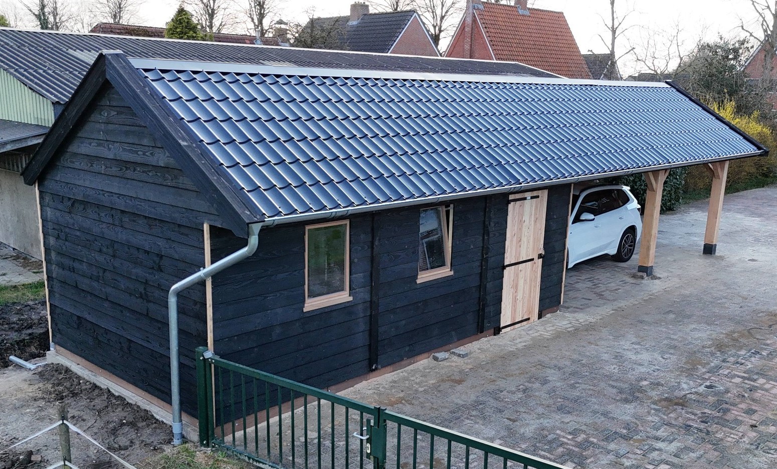 Het dak is voorzien van dakbeschot en afgewerkt met zwarte dakpanprofiel platen.