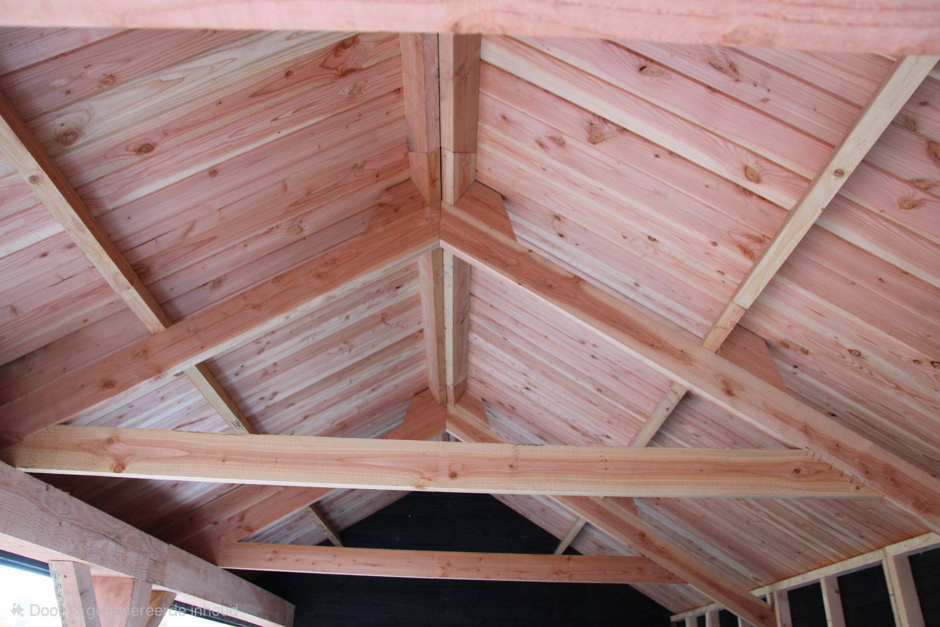 De staanders en liggers van 20cm x 20cm zijn uitgevoerd in blank, onbehandeld Larix, wat zorgt voor een robuuste en natuurlijke uitstraling.