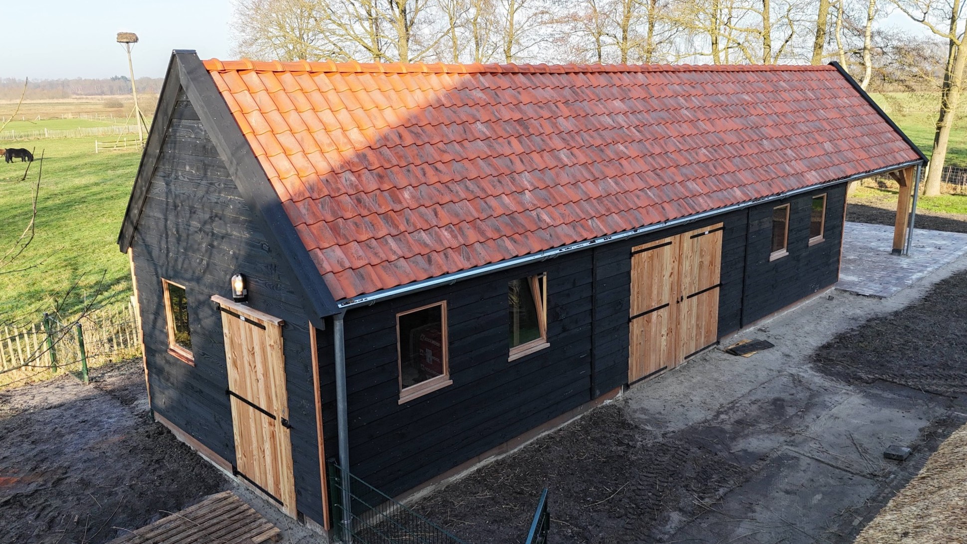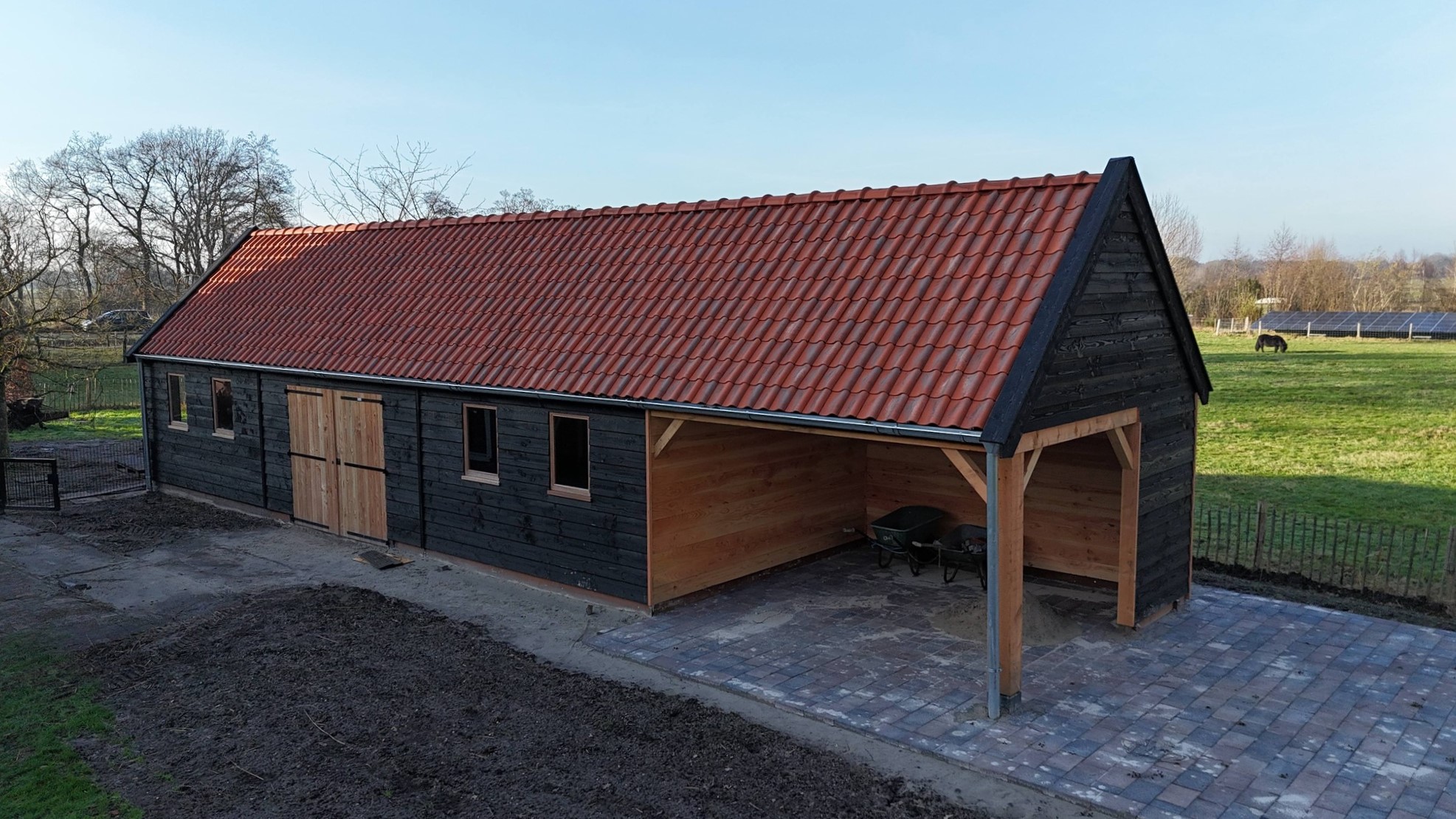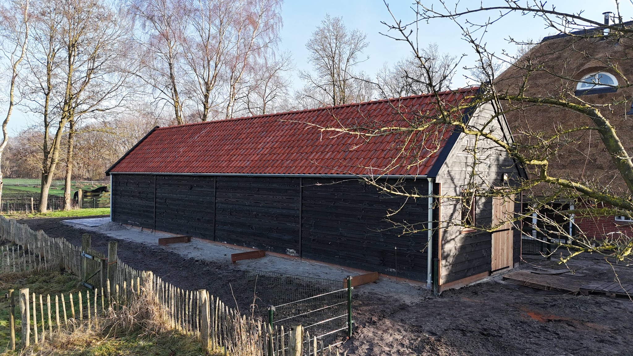 Wat een prachtig project, deze indrukwekkende berging met overkapping afmeting 400cm x 1600cm.