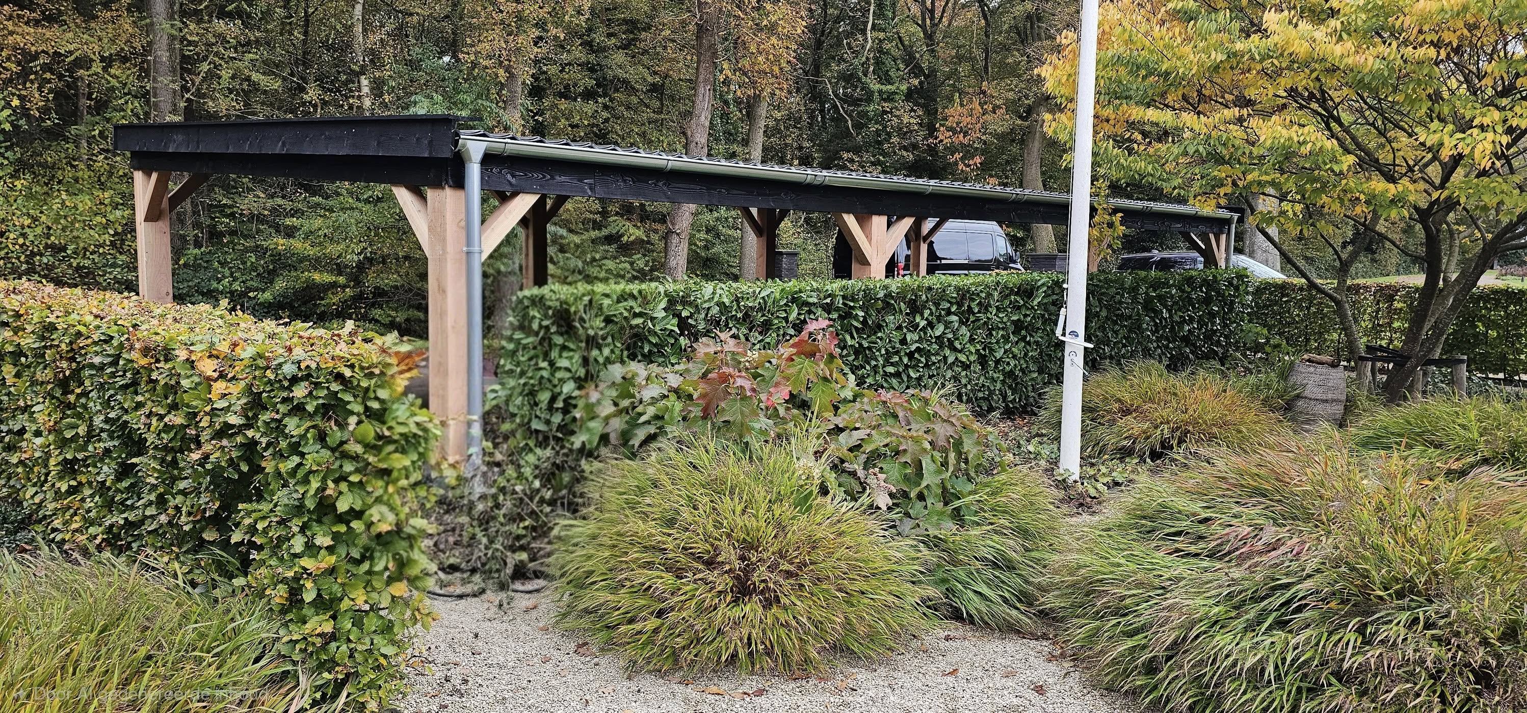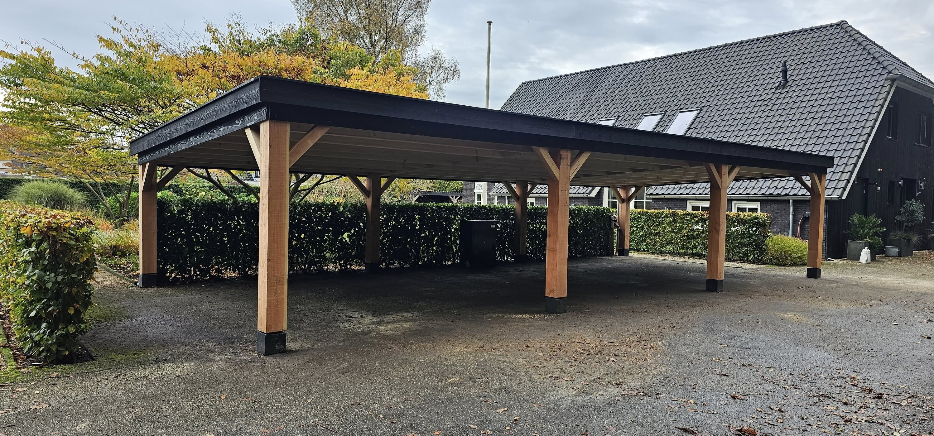 Uitgevoerd met stoere Larix Staanders 20cm x 20cm en een dak is uitgevoerd met zwarte dakpanprofielplaten die perfect bij de woning passen.
