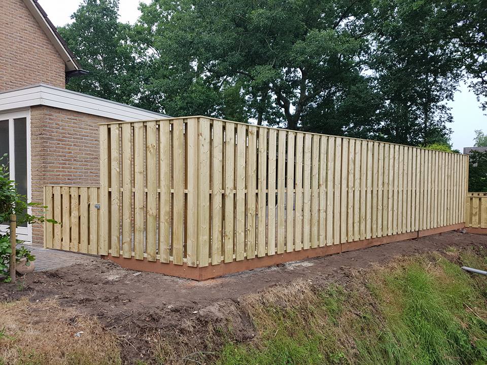 Schutting, vuren groen geiimpregneerd. Verticaaal, Geplaatst in Peize.