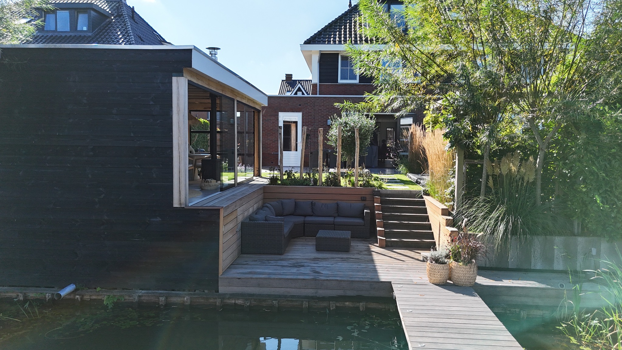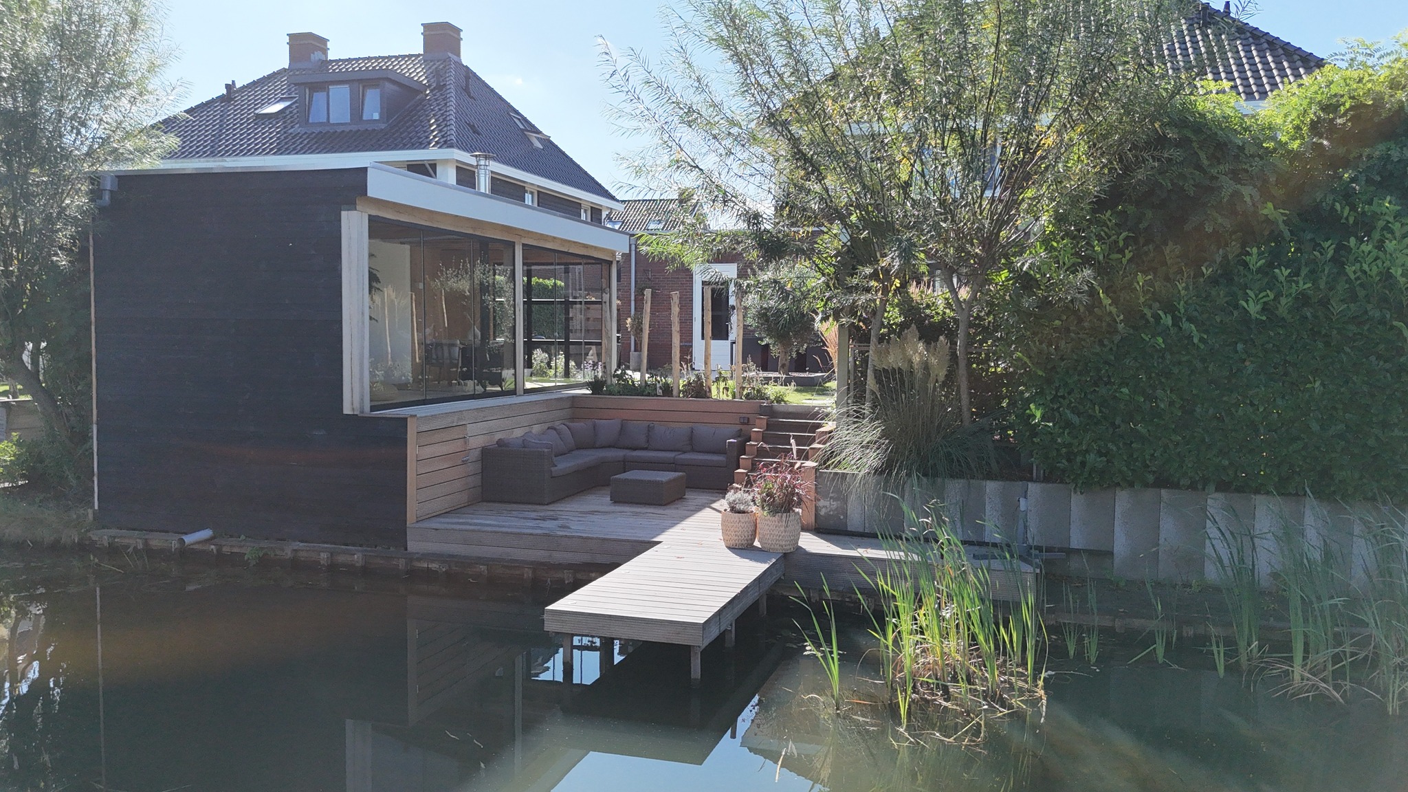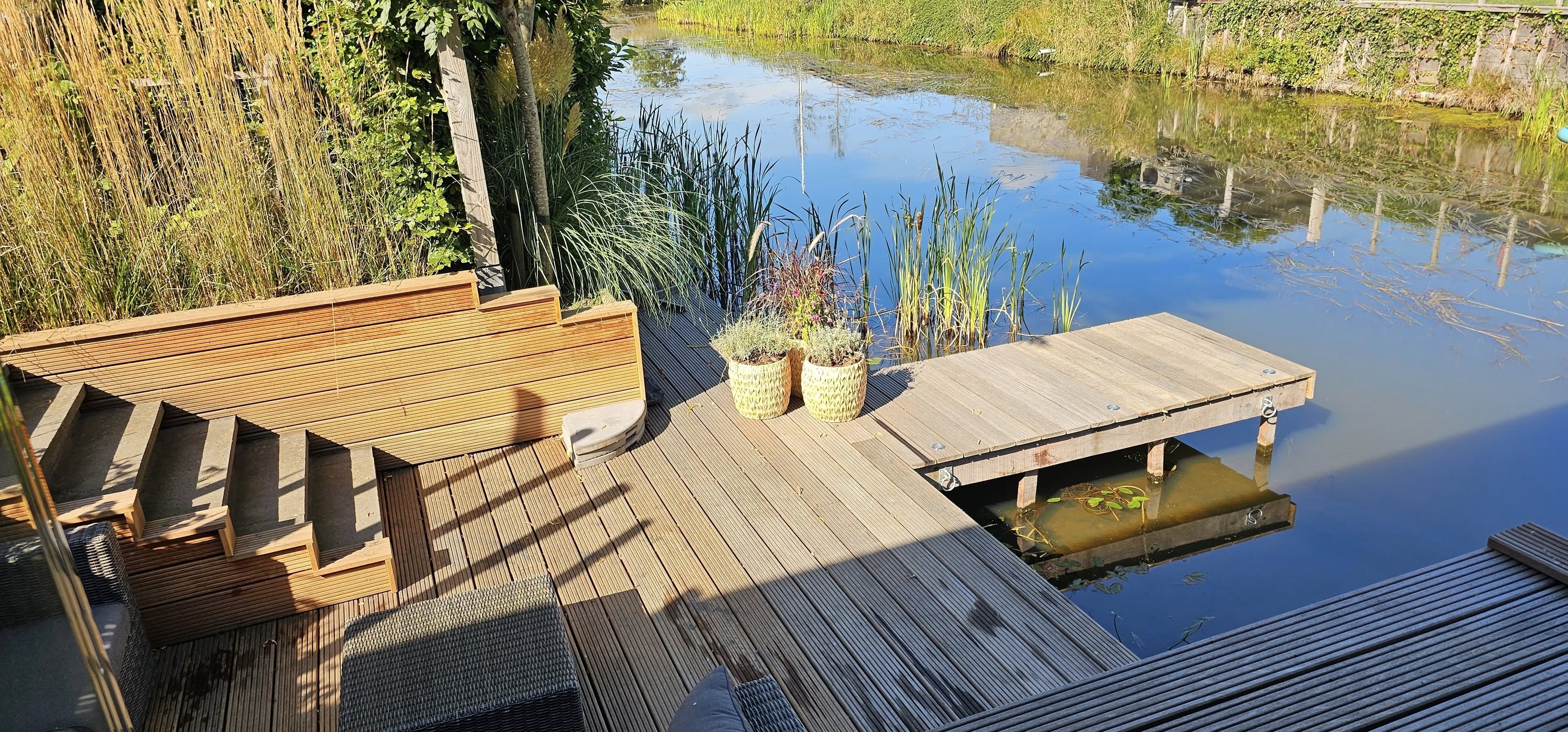 Vlonder / zitkuil. 310cm x 420cm. Hardhouten vlonderplanken. Geplaatst in Eelderwolde..