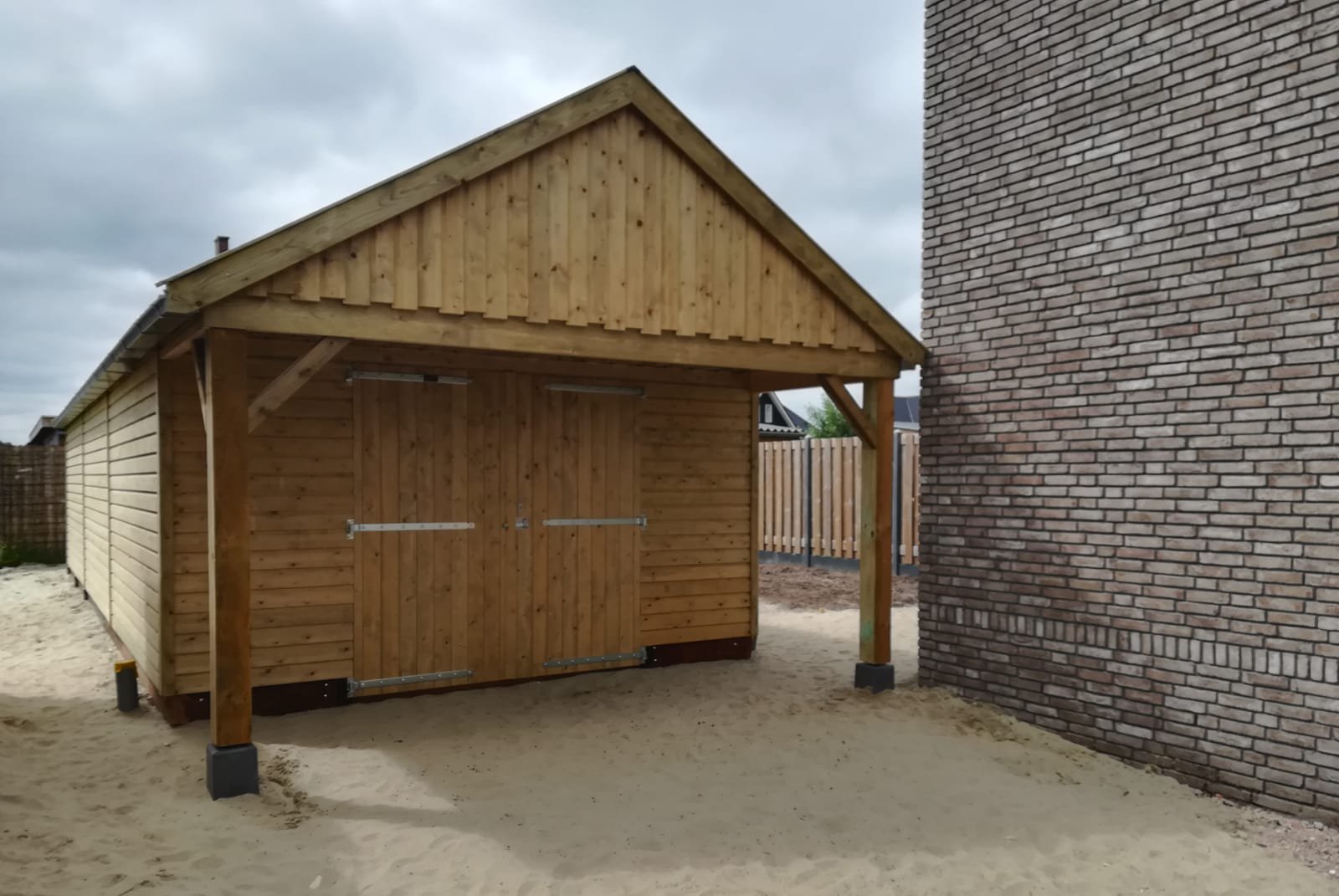 Garage / berging met aan weerszijden een overkapping en een luifel.