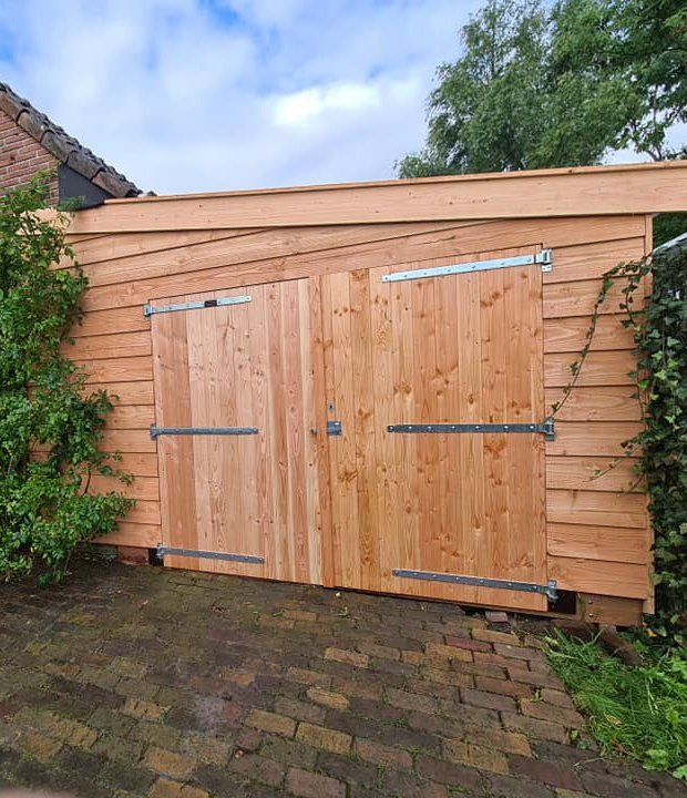 Schuur - Carport uitgevoerd in onbehandeld Larix. Geplaatst in Roden.