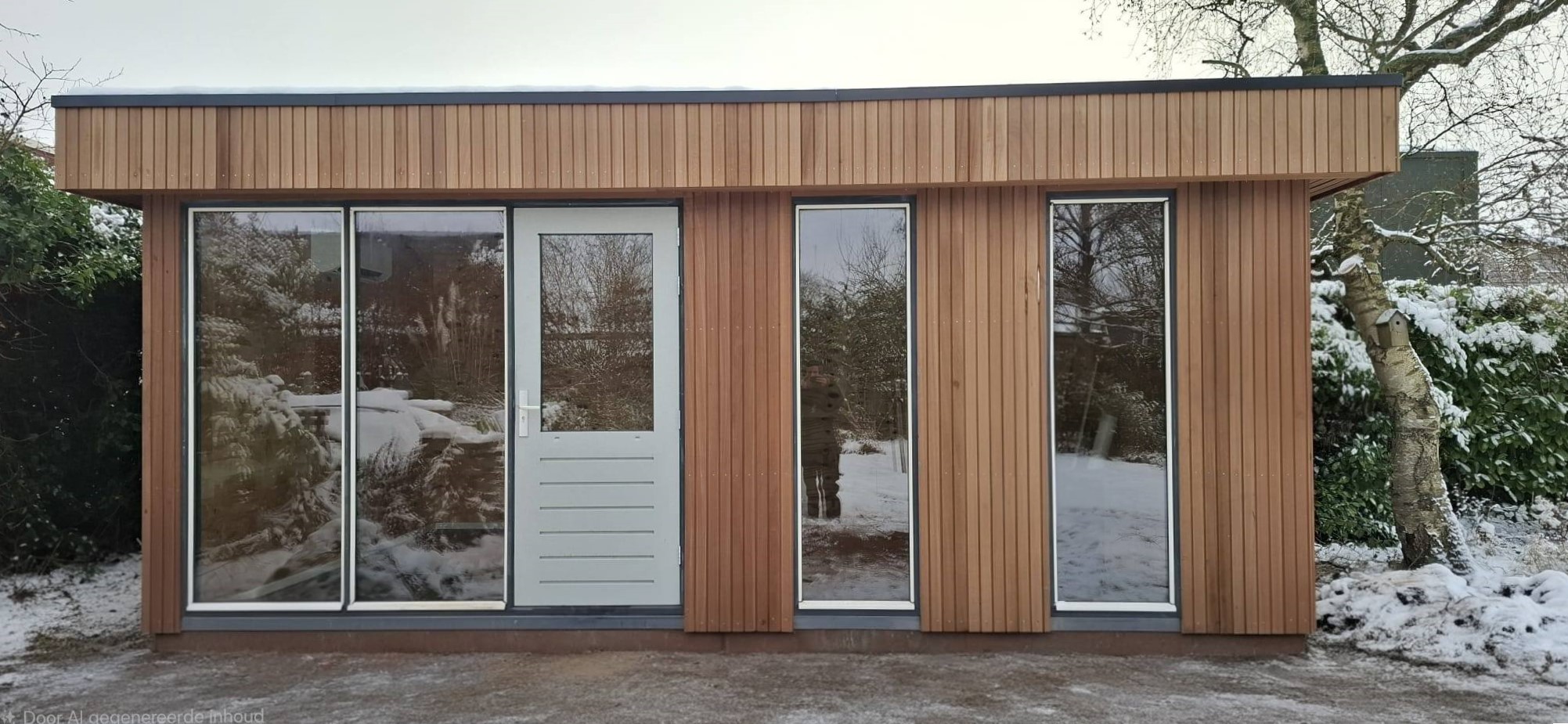 De hardhouten kozijnen zijn voorzien van HR++ beglazing met stijlvolle zwarte kaders wat het geheel een moderne en professionele uitstraling geeft.
